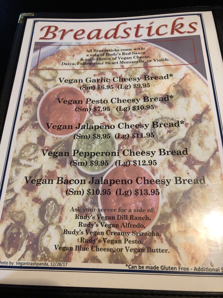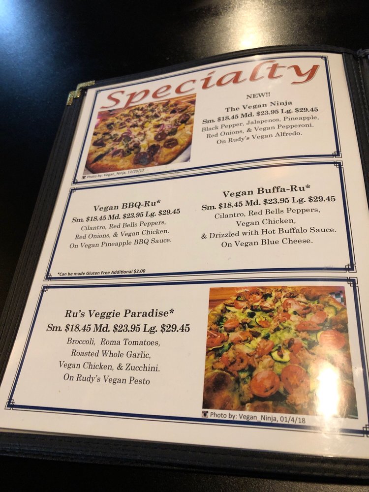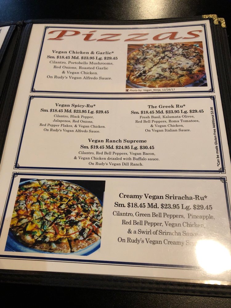 Rudy’s Gourmet Pizza in Portland offers a diverse menu with vegan options, including appetizers like cheesy breadsticks and wings, as well as a variety of salads. Customers praise the quick service and delicious gluten-free options, along with the flavorful and generous toppings on the pizzas. The Vegan Ninja pizza stands out for its unique combination of pineapple, red onions, jalapeños, and Alfredo sauce. The restaurant caters to various dietary needs, making it a dream come true for vegans and those with gluten sensitivities. Rudy’s friendly atmosphere and reasonable prices make it a popular spot for a satisfying meal, whether you're looking for a classic American greasy pizza or a healthier vegan option. Visit Rudy’s Gourmet Pizza for a taste of pizza perfection with a twist.
