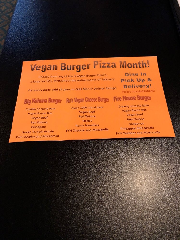 Vegan chicken, portabella mushrooms, basil, FYH mozzarella and Parmesan with Rudys special seasoning.